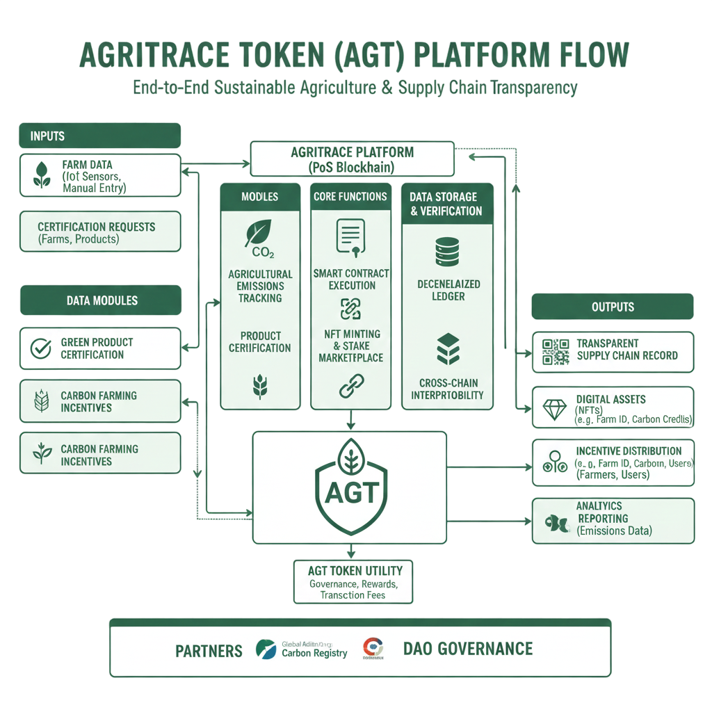 AgriTrace Token (AGT) is a blockchain-based digital asset focused on agriculture, supply chain transparency, and environmental sustainability. The project aims to promote sustainable agriculture through agricultural emissions data tracking, green product certification, and carbon farming incentive mechanisms.